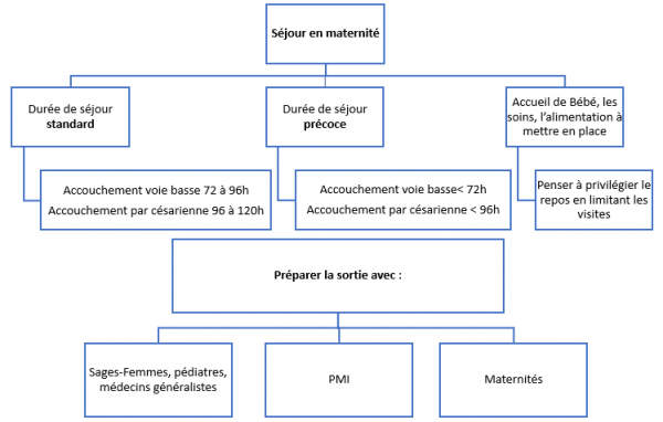 Vous pouvez consulter le site internet de la maternité où vous souhaitez accoucher. La durée de votre séjour dépendra de votre état de santé et de celui de votre enfant.