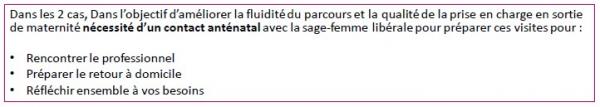 Dans les 2 cas, dans l’objectif d’améliorer la fluidité du parcours et la qualité de la prise en charge en sortie de maternité nécessité d’un contact anténatal avec la sage-femme libérale pour préparer ces visites pour :