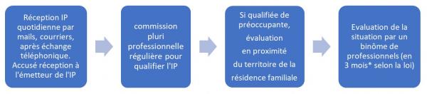 Il s’agit de tout élément d'information pouvant laisser craindre que la santé d'un mineur, sa sécurité ou sa moralité sont en situation de danger ou en risque de danger ou que les conditions de son éducation ou de son développement physique, affectif, intellectuel et social sont gravement compromises ou en risque de l'être et devant faire l'objet d'une transmission à la cellule de recueil des informations préoccupantes du Département (CRIP) aux fins d'évaluation.